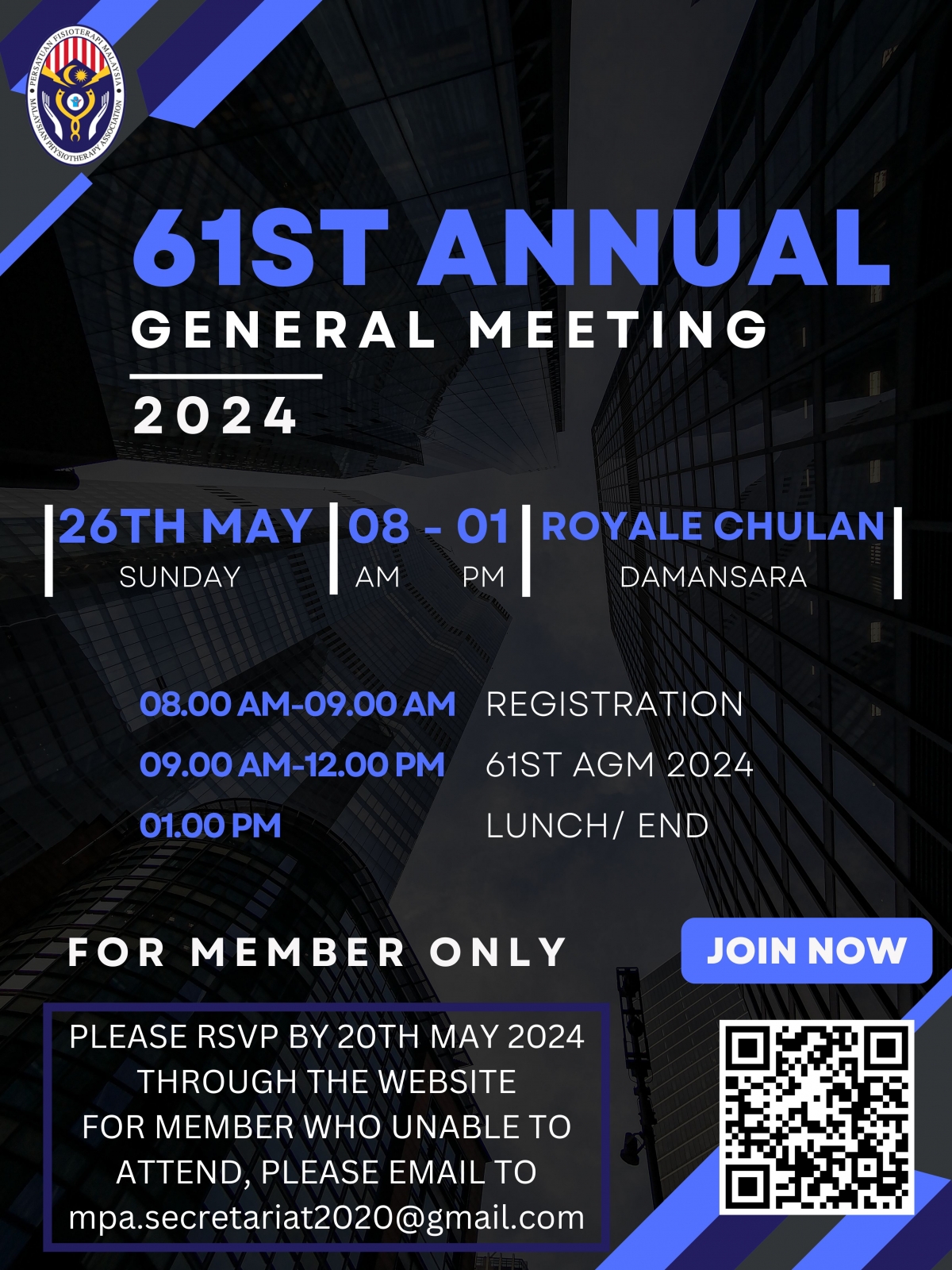 Join us for the 61st Annual General Meeting of the Malaysian Physiotherapy Association (MPA) that will be held on Sunday, 26th May 2024 at 8.00 am to 1.00 pm.