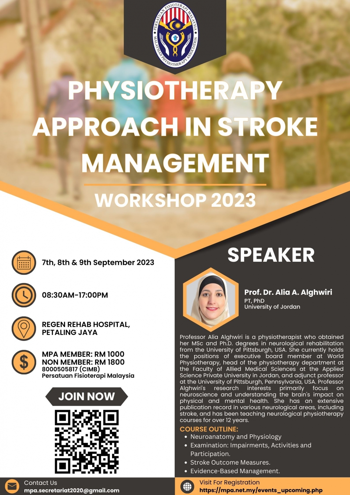 Physiotherapy Approach in Stroke Management Workshop 2023 organized by MPA Neurology Special Interest Group is happening on 7th, 8th & 9th September 2023.