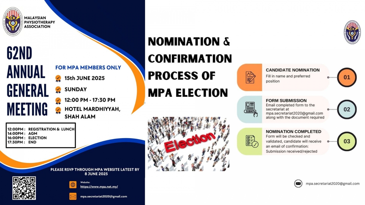 Join us for the 62nd Annual General Meeting of the Malaysian Physiotherapy Association (MPA) that will be held on Sunday, 15th June 2024 at 12.00 pm to 17.30 pm.