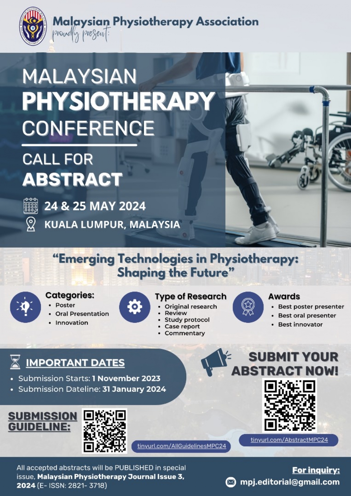 📚 All accepted abstracts will be published in special issue, Malaysian Physiotherapy Journal, Issue 3, 2024 (e-ISSN: 2821-3718).