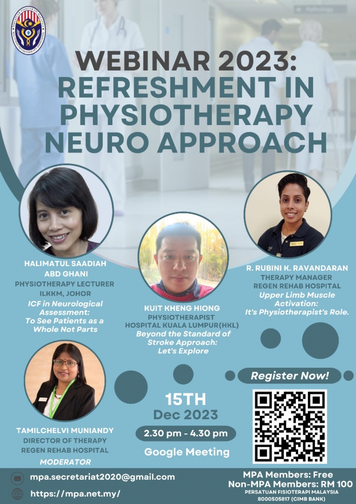 Webinar 2023: Refreshment in Physiotherapy Neuro Approach, organized by the MPA Neurology Special Interest Group, is happening on 15th December 2023.