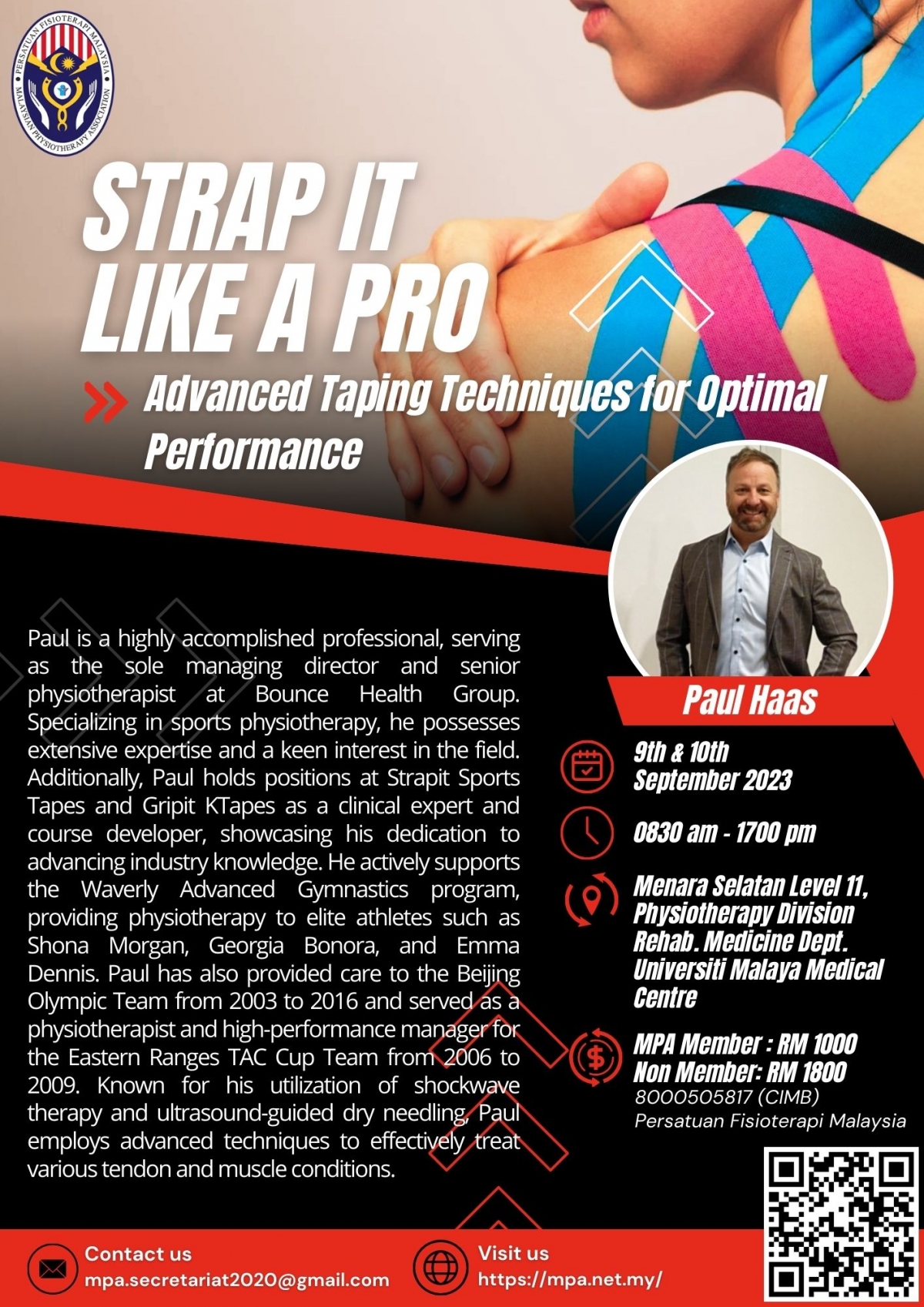 Strap it Like a Pro: Advance Taping Techniques for Optimal Performance Workshop 2023 organized by MPA Sport Special Interest Group is happening on 9th & 10th September 2023.